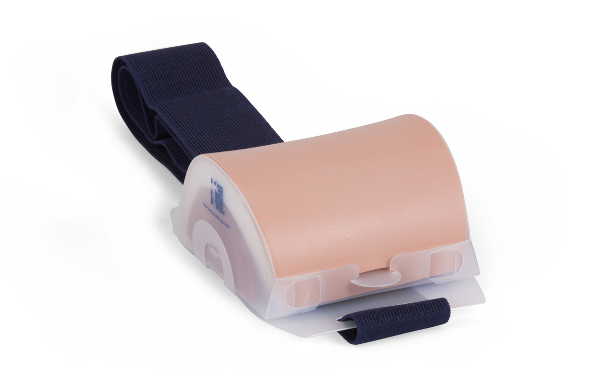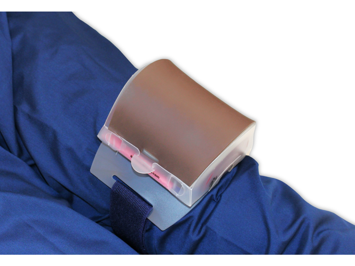 The trainer is lightweight, portable, and comes with a strap-on base plate to be attached to an arm or thigh of a simulated patient. This allows for scenario-based training to help teach professional-to-patient communication. Alternatively, injection procedures can be performed on tabletop.