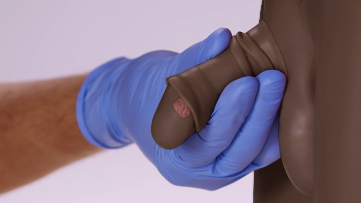 - Penis, foreskin and scrotum respond in a life-like way under examination, adding realism