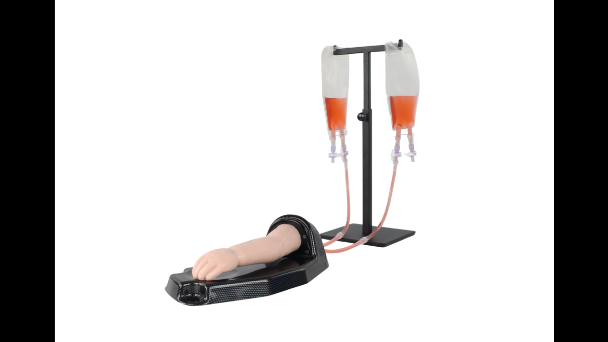 Perform peripheral venous cannulation in the arm and hand, at the dorsal venous arch, cephalic vein and basilic vein locations. Trainees can practise withdrawal and administration of fluids.