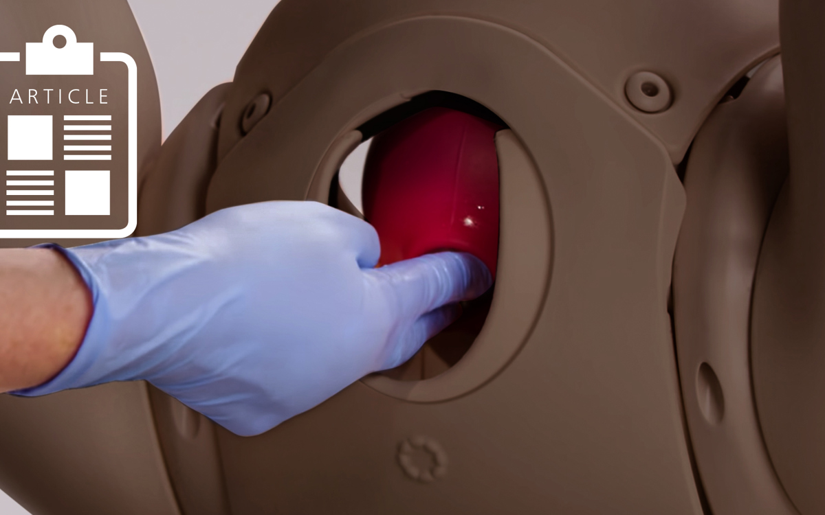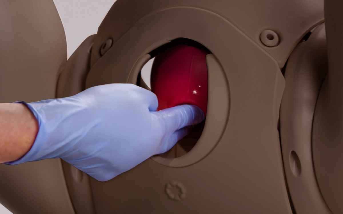 The module also comes equipped with a set of interchangeable cervixes for the simulation of active labour, and a range of presenting parts which allow the healthcare professional to determine the position of the fetus by palpating the sutures and fontanelles. Moulding and caput formation can occur when the fetal head is descending into the birth canal and may increase with prolonged labour. While completely normal, this can challenge the practitioner in the proper assessment of labour progression. While the rupture of membranes often occurs spontaneously in labour, it is possible for the healthcare professional to intentionally rupture the membranes, known as amniotomy, as a way to augment labour. The model allows for realistic artificial rupture of membranes using real supplies used at the bedside.
