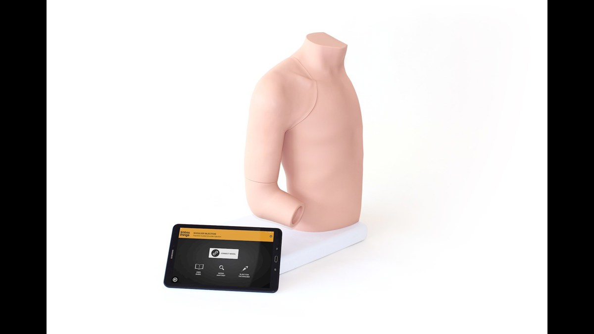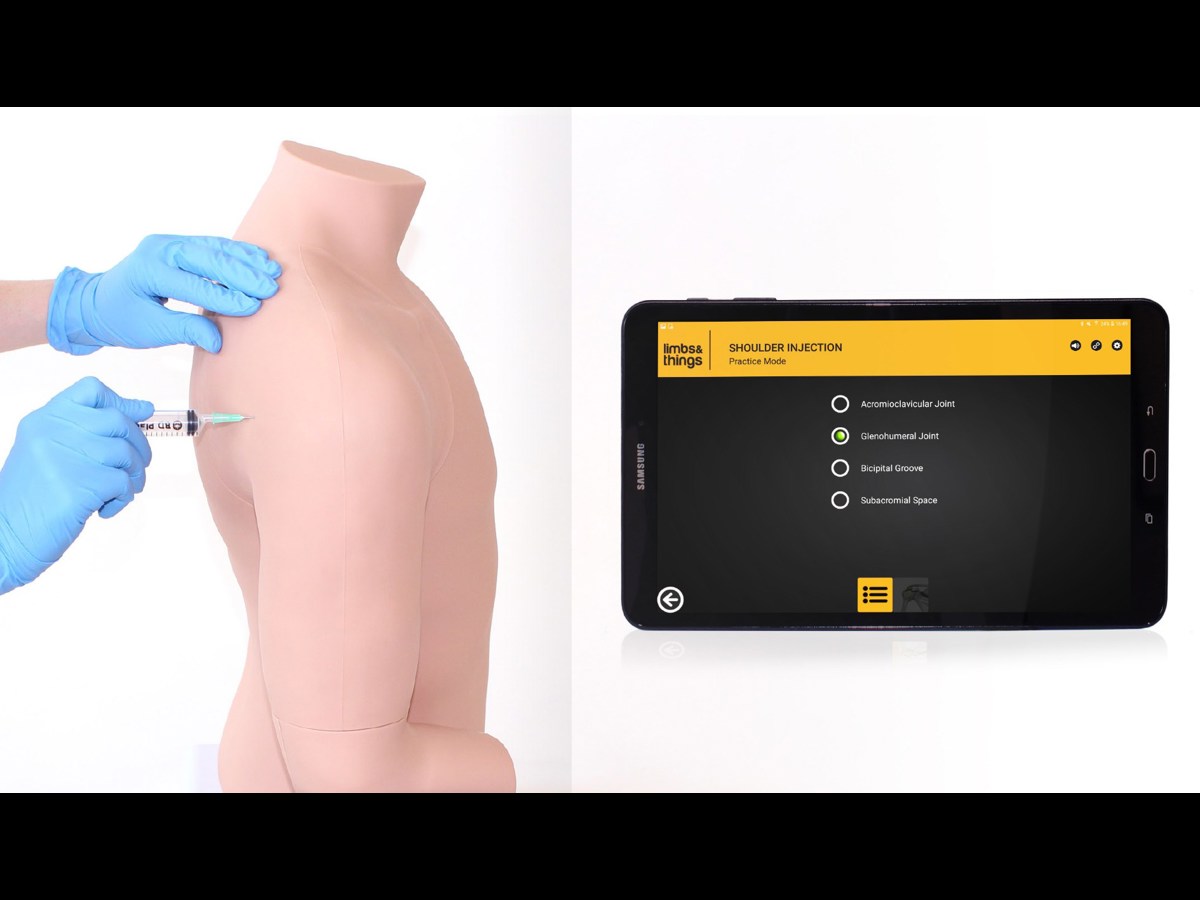 Yes, the Shoulder Trainer has an accompanying app which allows trainees to view expert guidance on best practise for joint injections. Instant feedback from the model will give positive reinforcement once the correct site is hit.