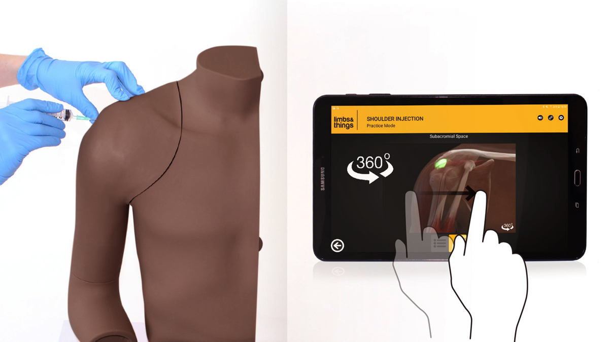 This palpation guided shoulder injection trainer comes with an Android Tablet and a preinstalled app for use during training. The latest model is now completely wireless, utilising Bluetooth to communicate with the app for feedback. Once the shoulder is connected to the application users can access: