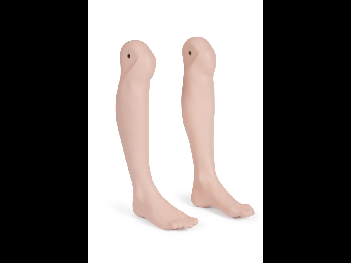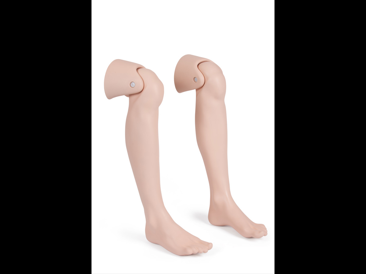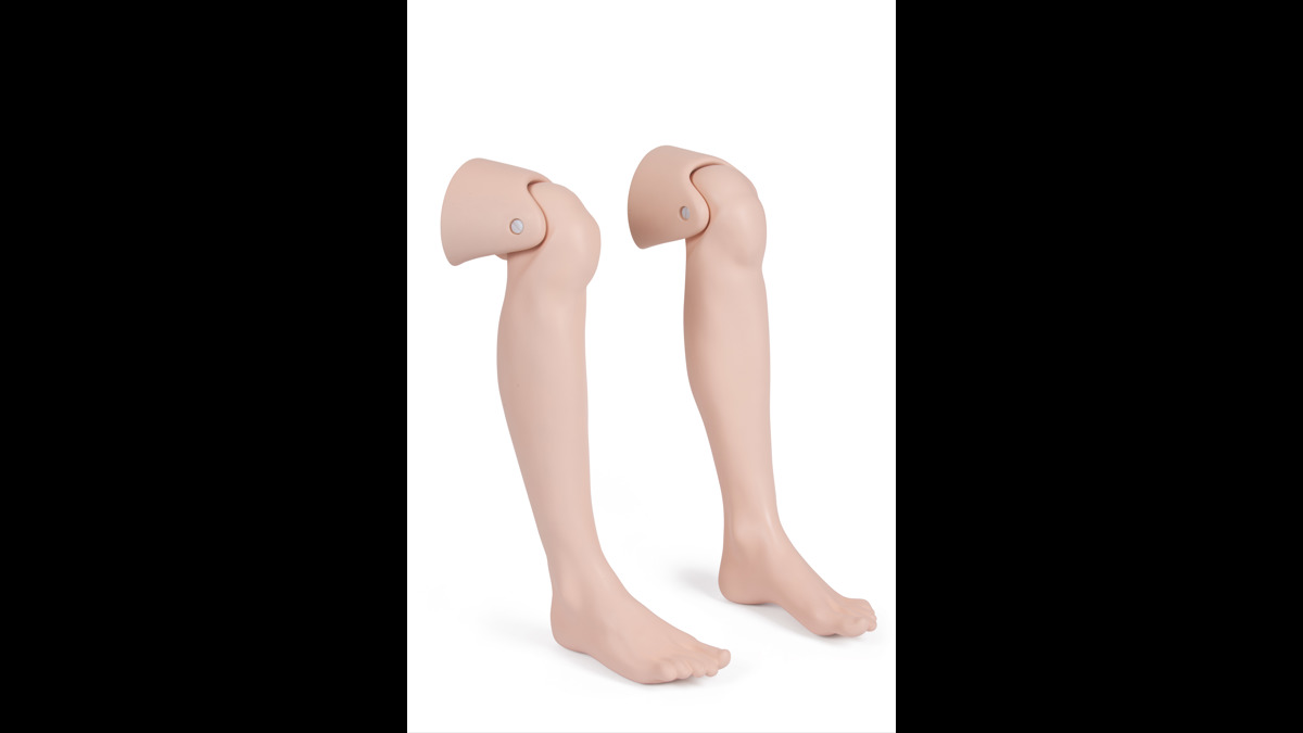 A pair of lower legs with knee joint interface for extended realism when running a shoulder dystocia drill or when using a simulated patient.