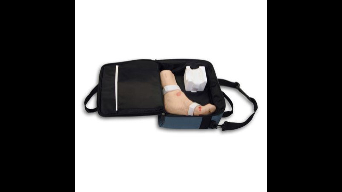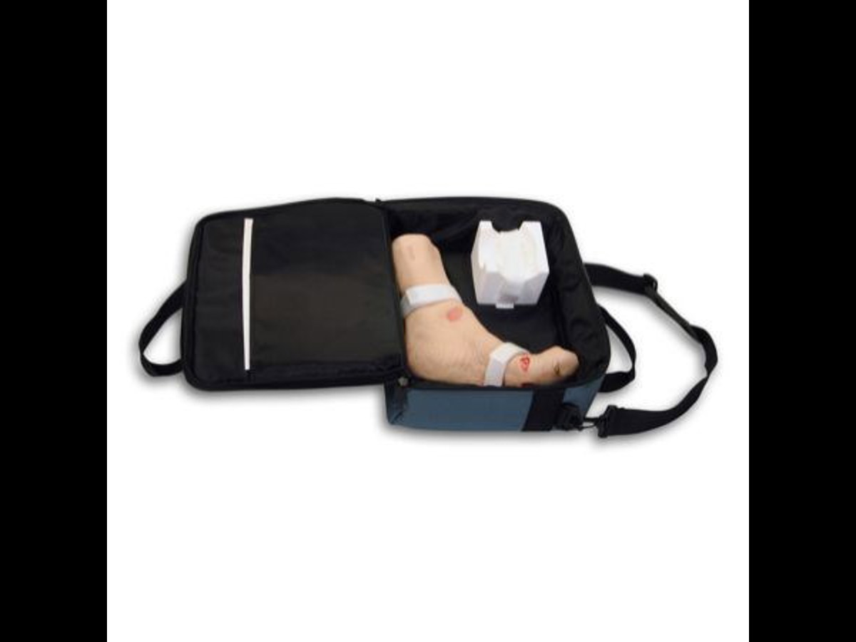 A durable, zippered, padded fabric case with carrying handles and storage pouch for supplies for Wilma Wound Foot.