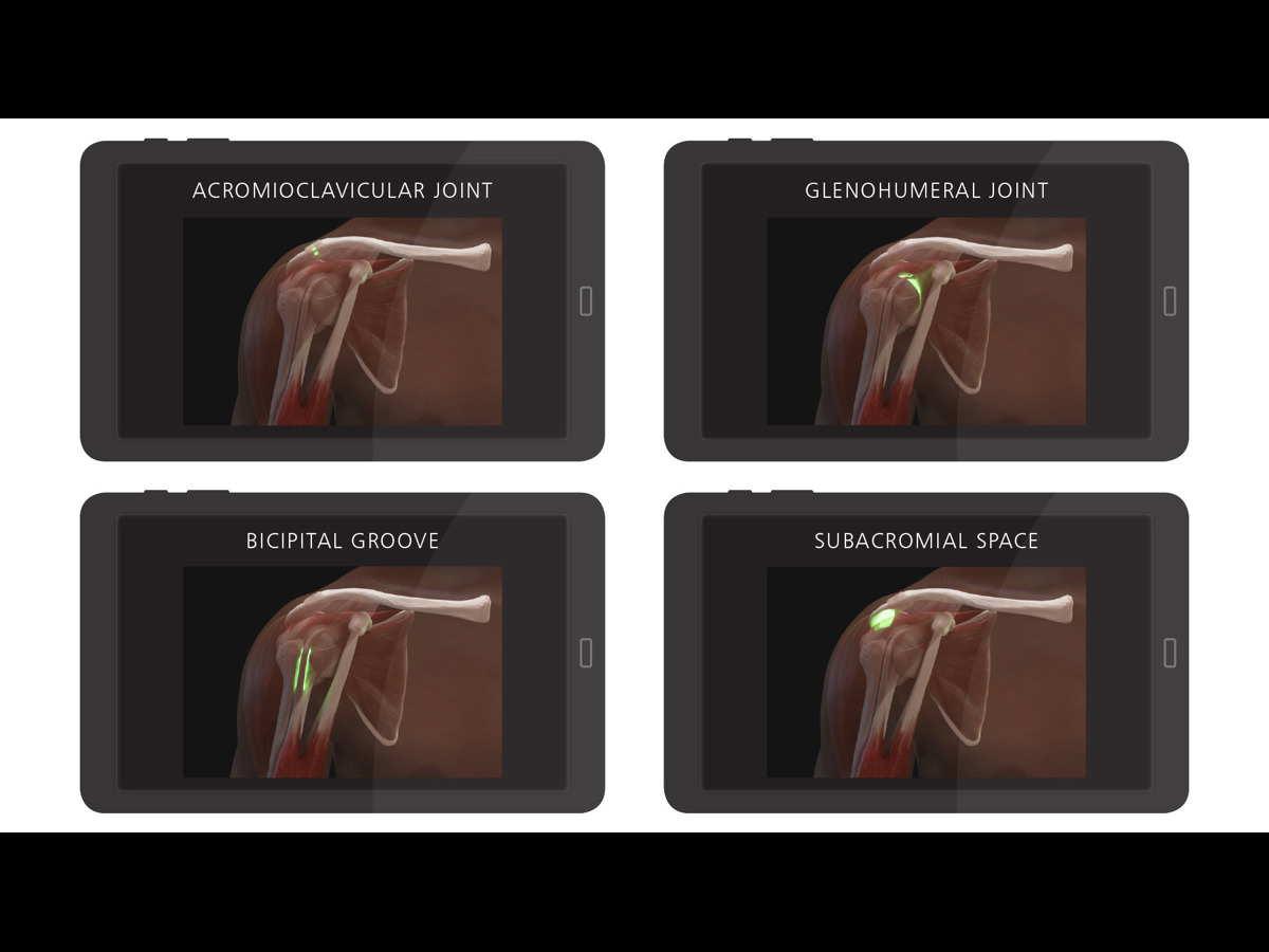 - Palpation of shoulder to find the four most common injection points