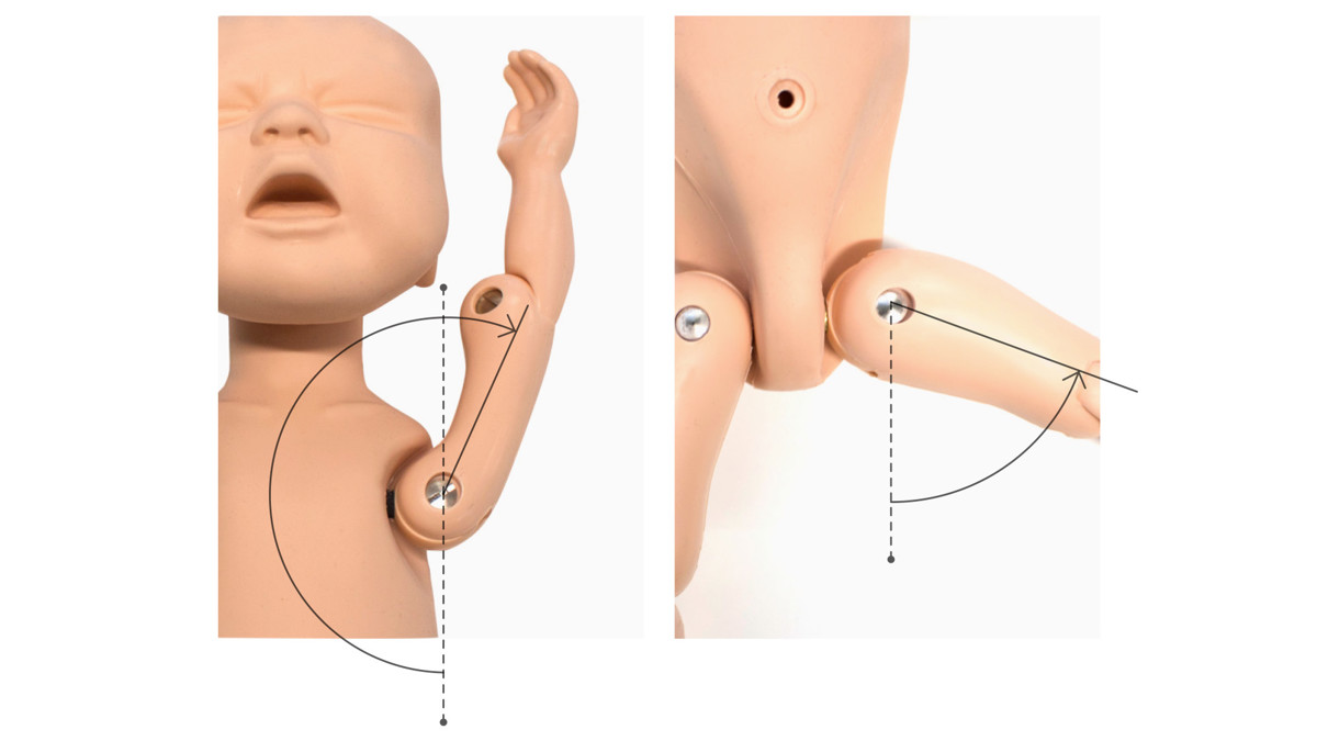 Articulation in the shoulder and hip joints further enhances the realism for difficult birthing scenarios such as deeply impacted head and shoulder dystocia.