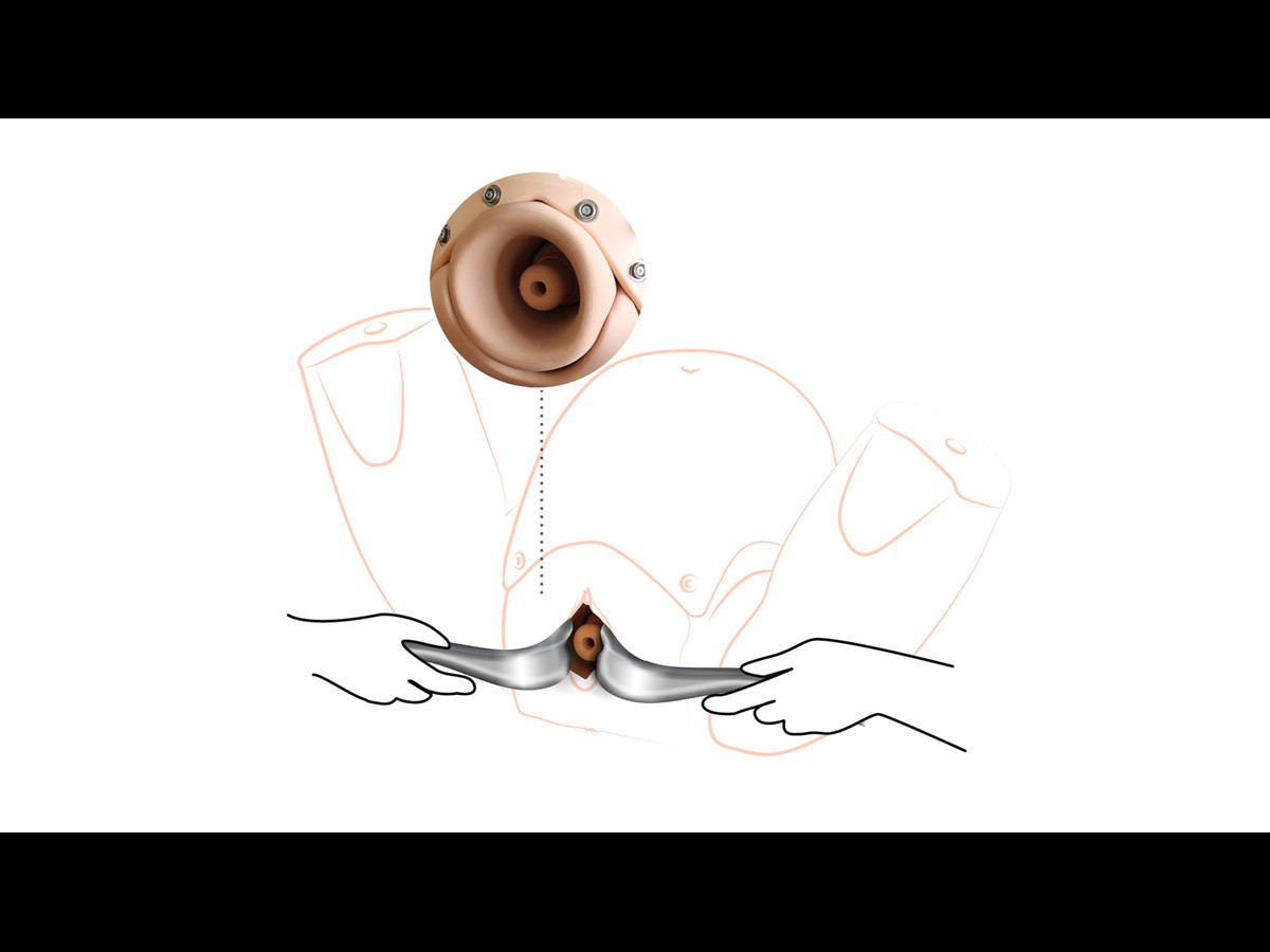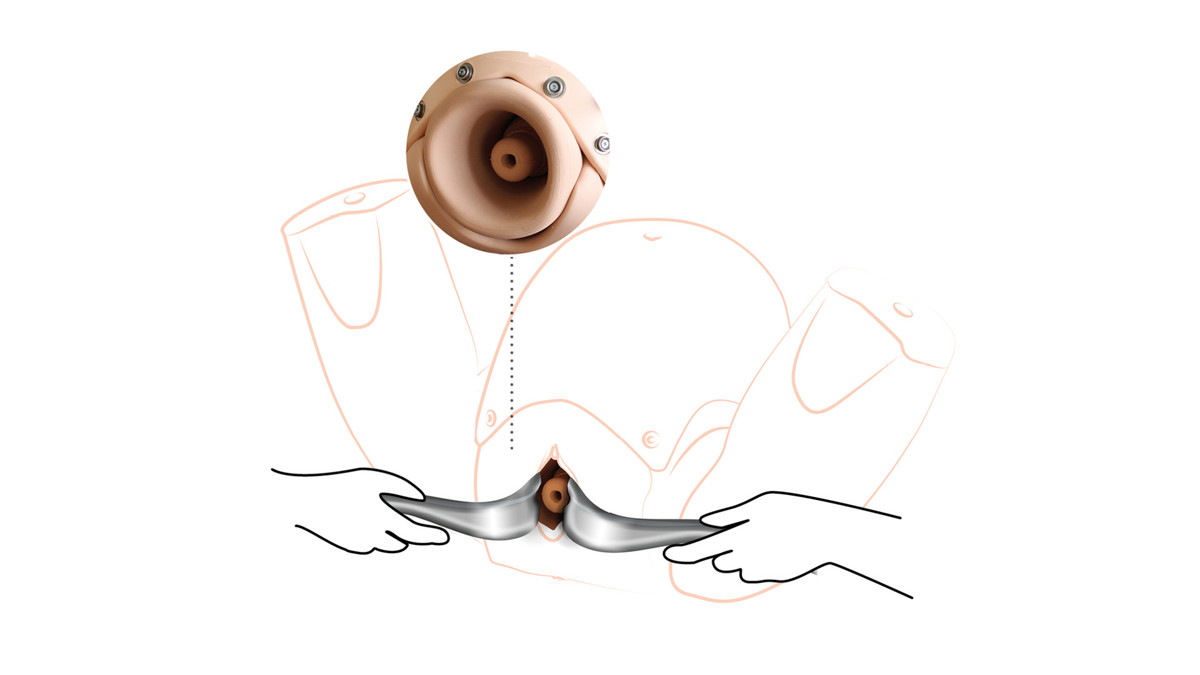 Realistic representation of a dilating cervix and bulging membranes with soft parting labia and accurately sized vaginal vault mimicking the confined space available when performing the procedure