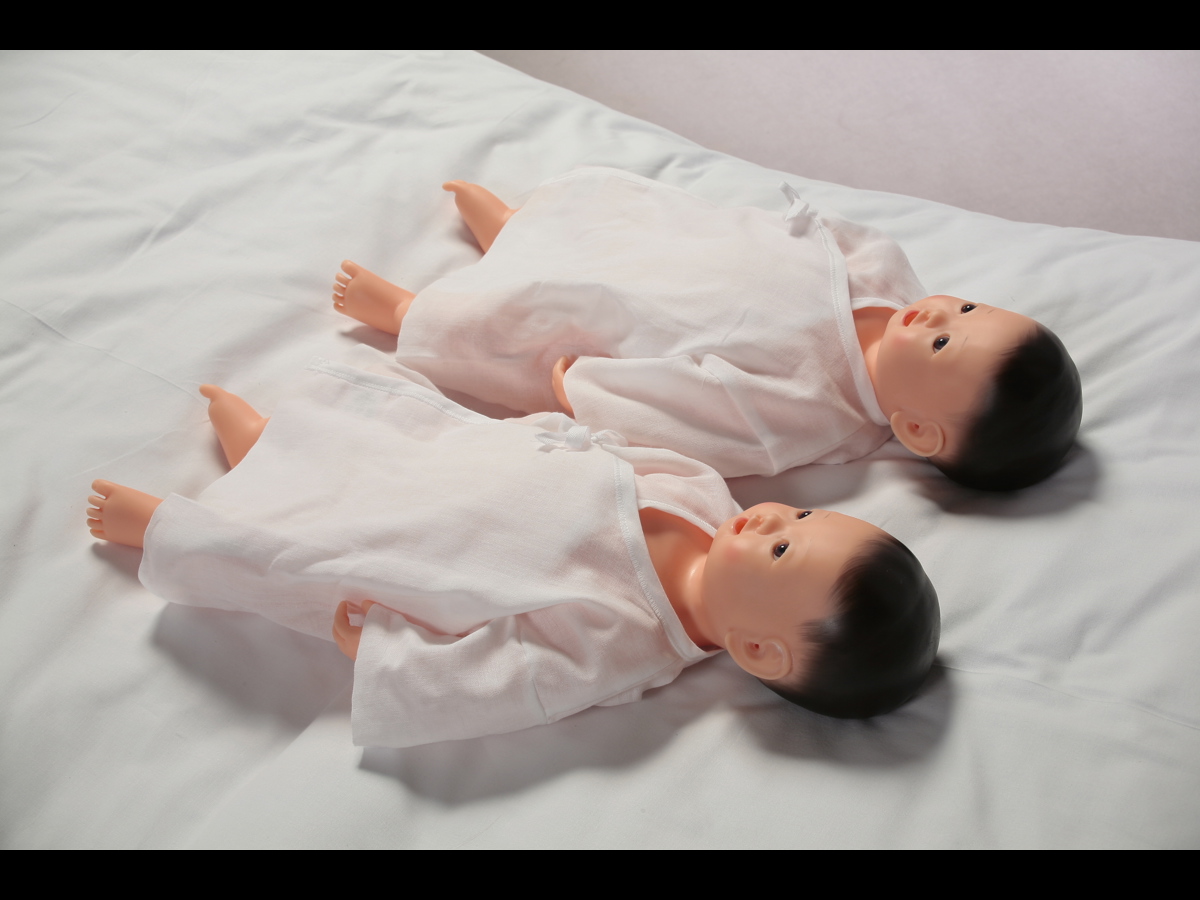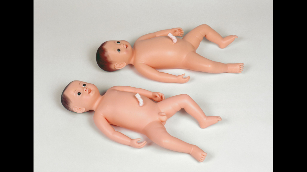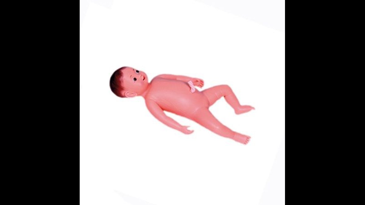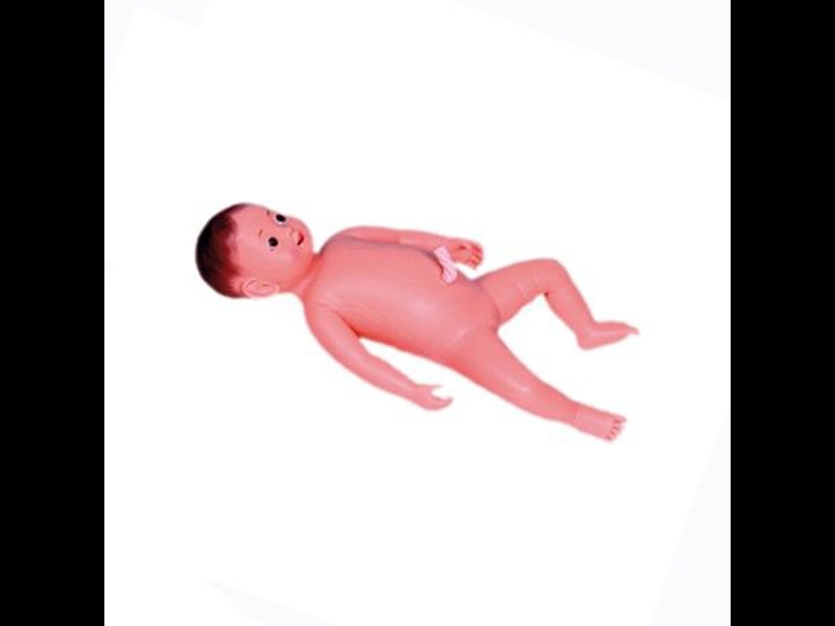 This model is a life-size manikin for a 0-4 week old infant that replicate the weight and anatomy of a newborn with palpable fontanels.