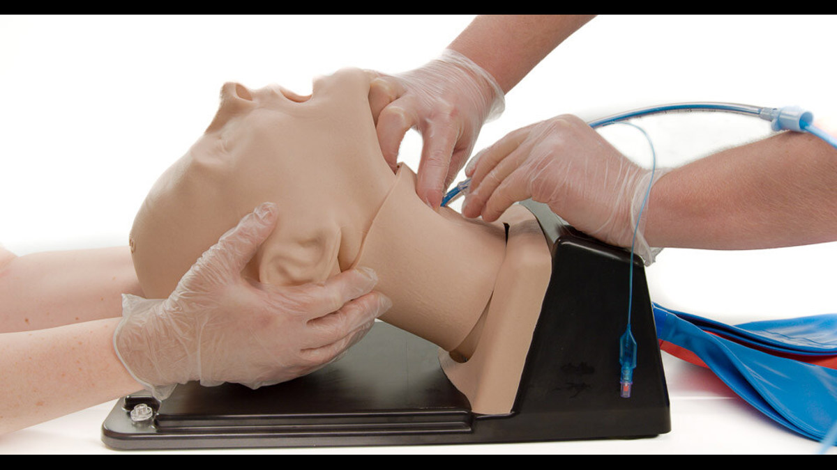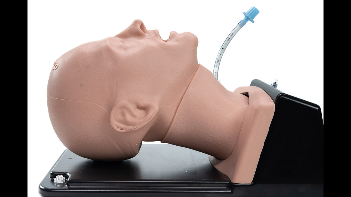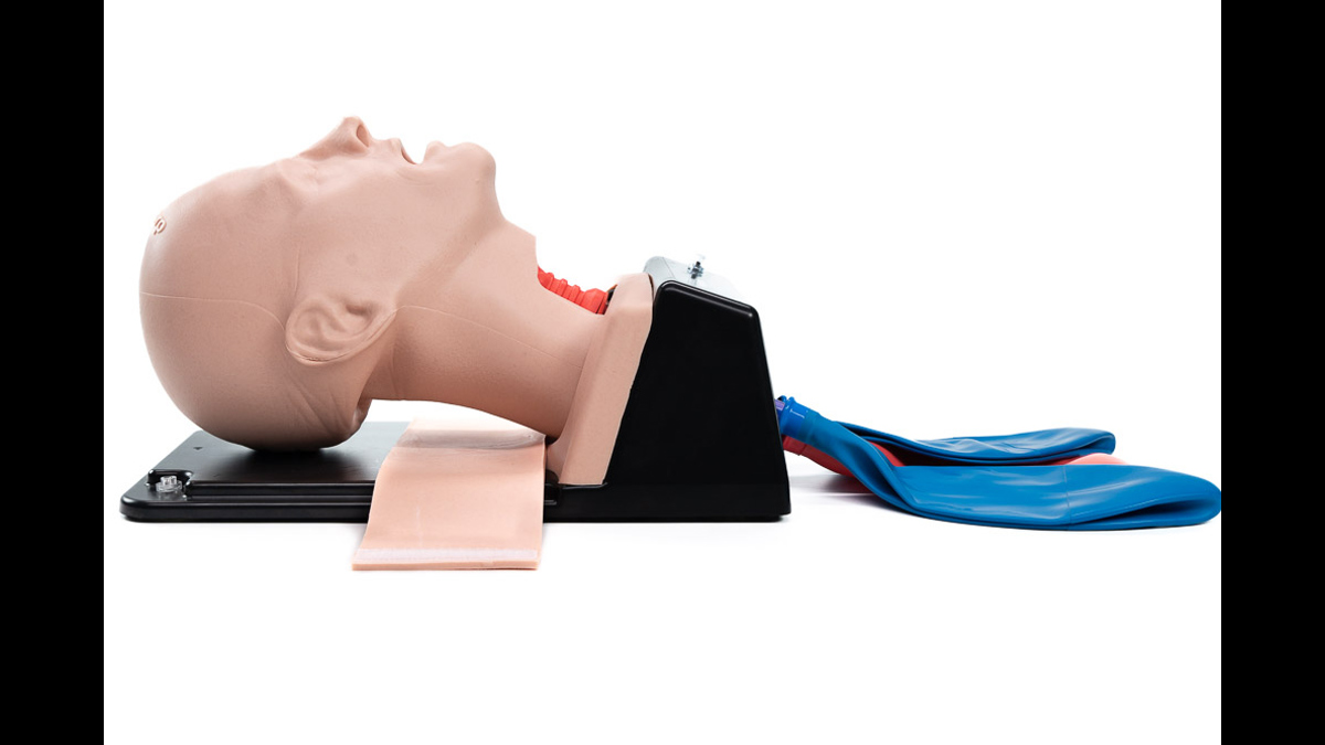 The TruCorp AirSim Combo X manikin combines intubation and cricothyrotomy training in one life-like model.