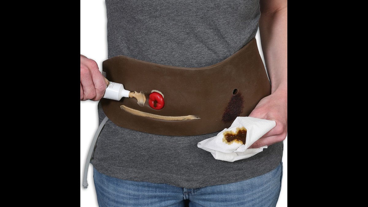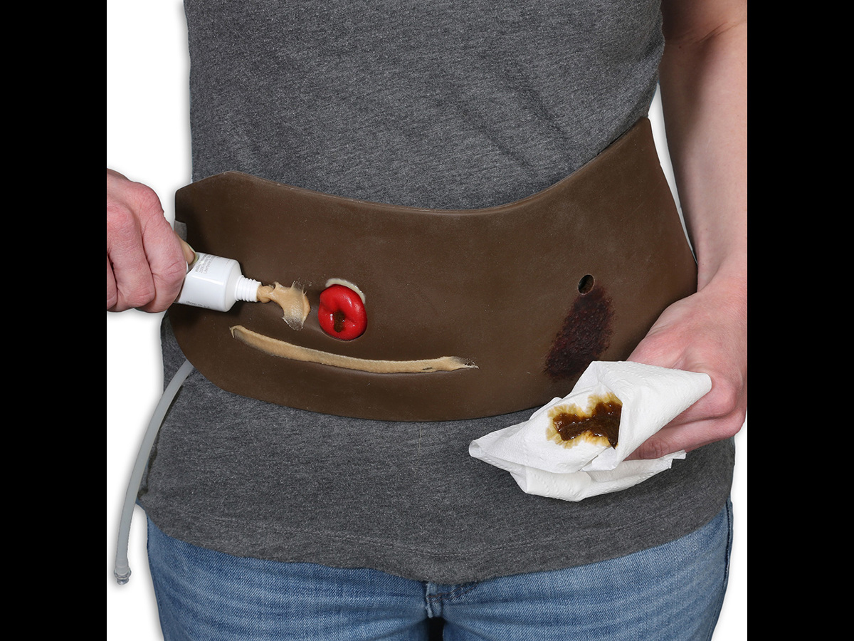 - Flush stoma - Each stoma can have simulated stool or urine output and can be placed in four locations: