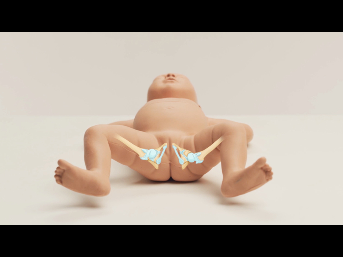 - Articulated knee and ankle joints mean the baby’s feet can be placed flat on a bed replicating the Galeazzi sign