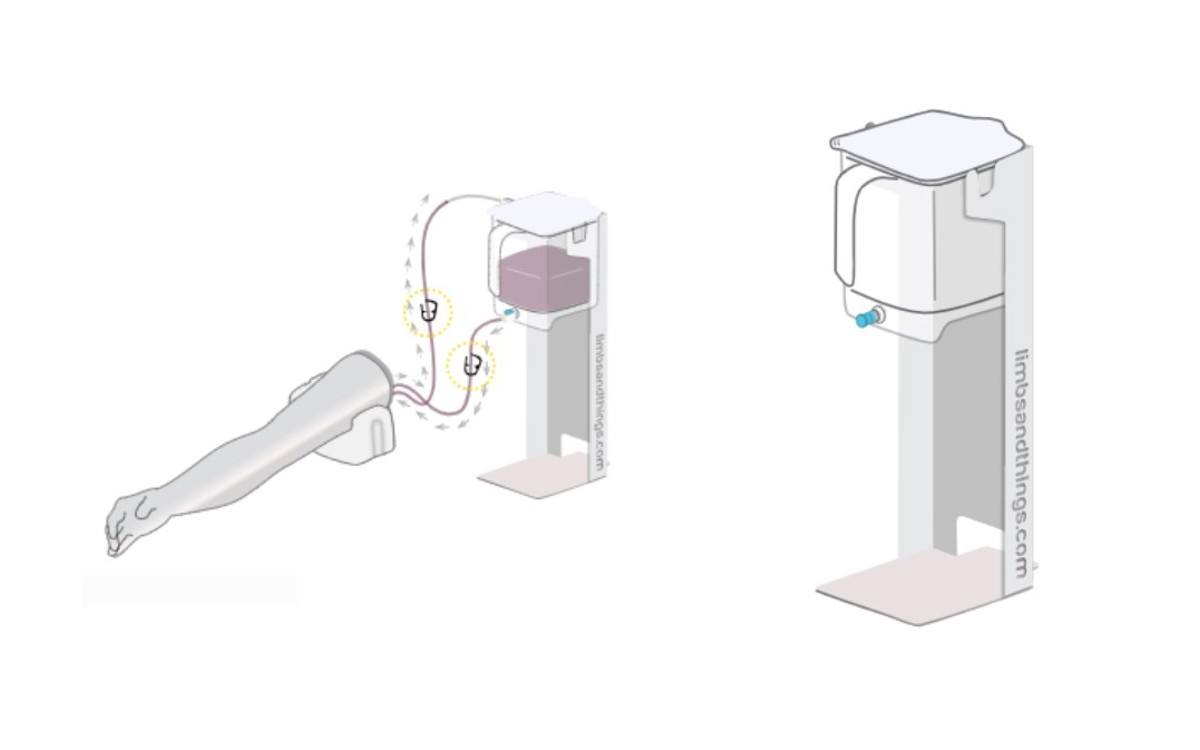 The arm trainers are supplied with a 2.5l blood starter pack jug containing a measure of concentrated blood. When diluted (as per the instructions) the 2.5l of fake venous blood can be fed into the blood system and emptied back into the jug at the end of a session.
