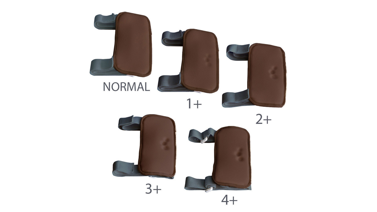 Kyoto Kagaku’s Pitting Edema Strap On Simulator is comprised of five variations of pitting edema pads. Graded from Normal to +4, it offers different resistances, depths of indentations, and length of time to rebound.