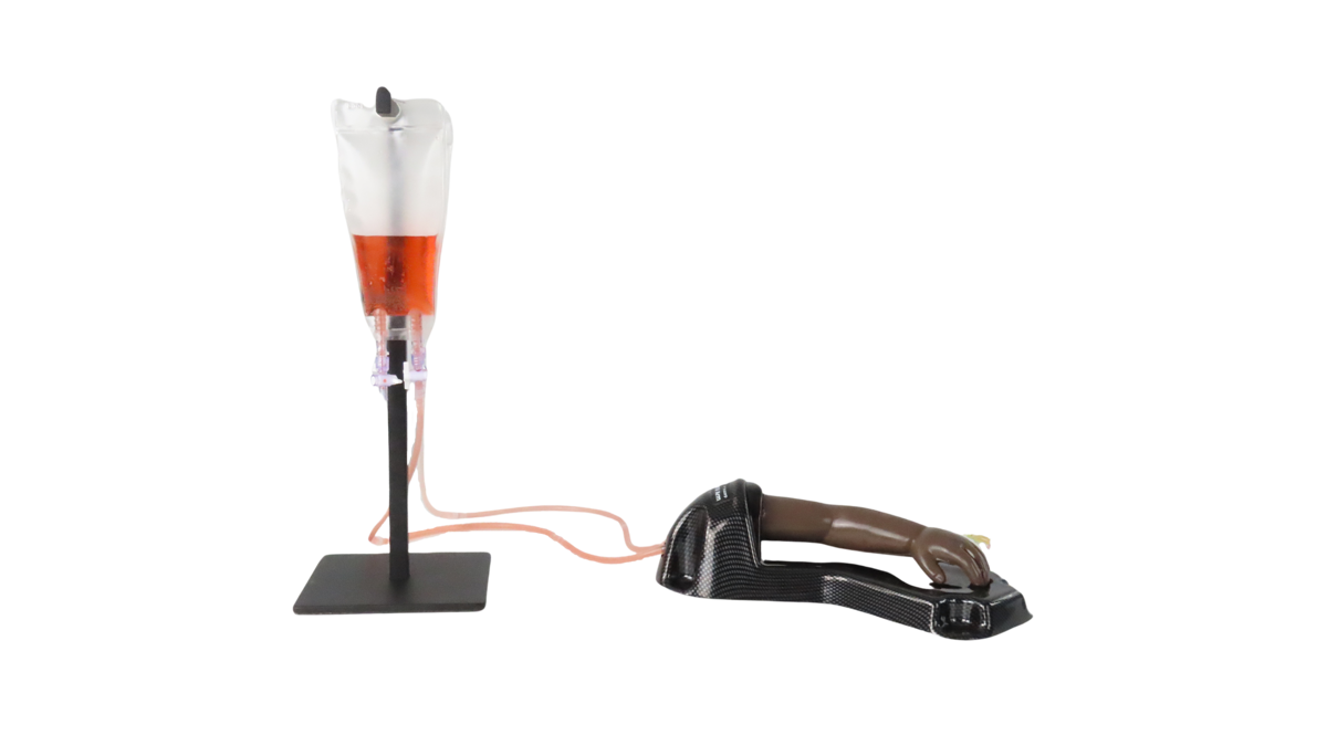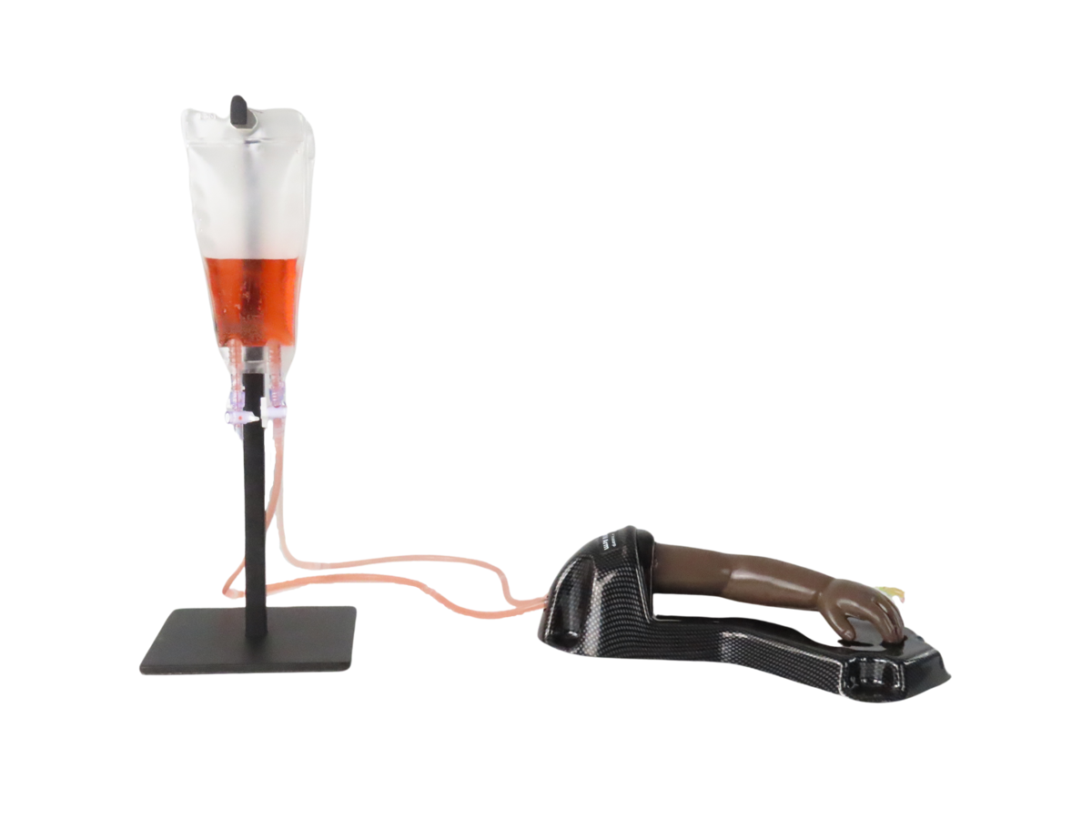 Perform peripheral venous cannulation in the arm and hand, at the dorsal venous arch, cephalic vein and basilic vein locations. Trainees can practise withdrawal and administration of fluids.