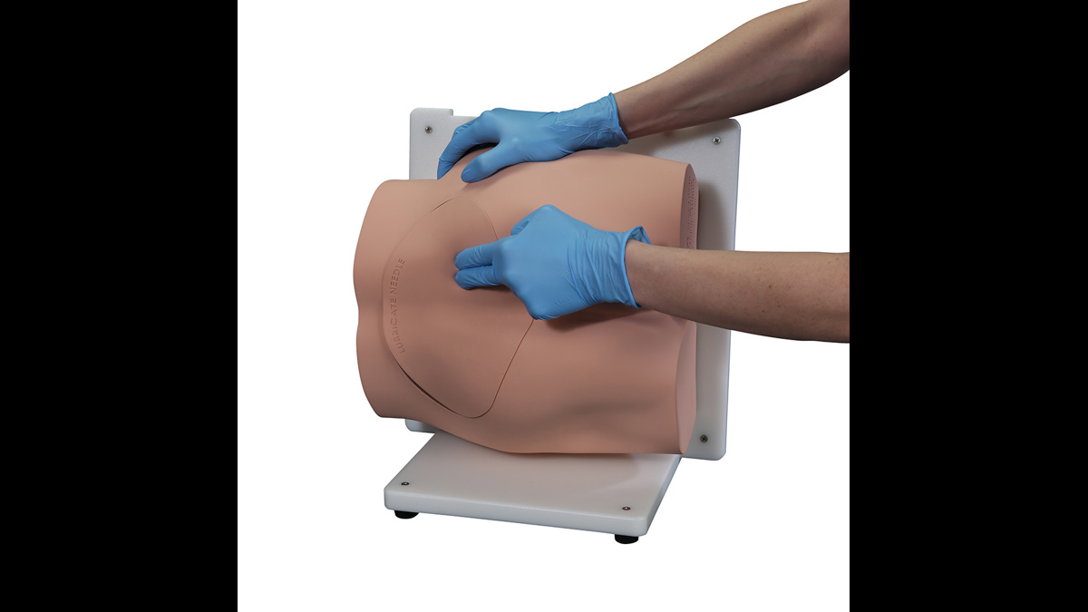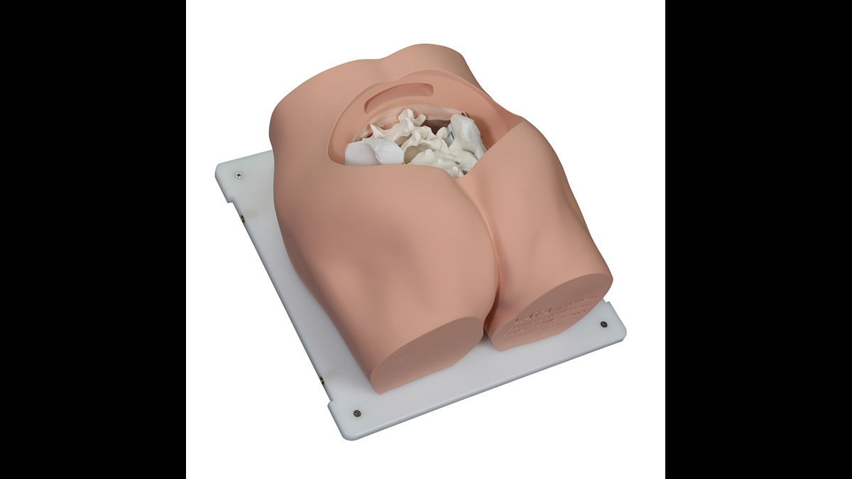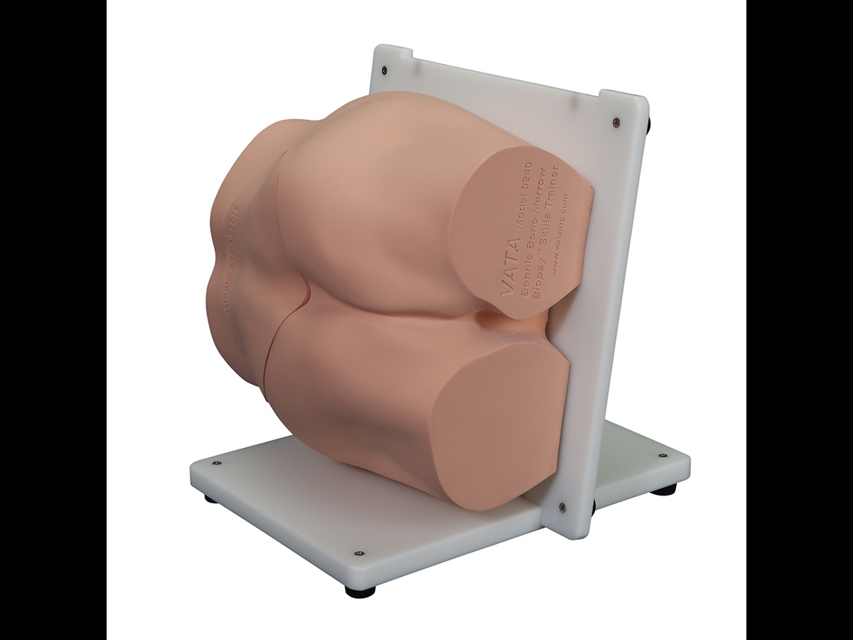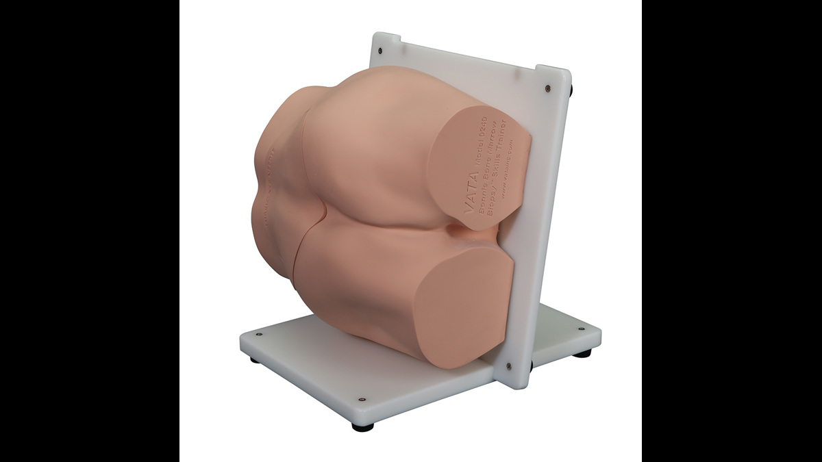 A realistic skills trainer, designed with clinician input to replicate, teach and reinforce the skills needed to perform a posterior iliac crest bone marrow biopsy procedure.