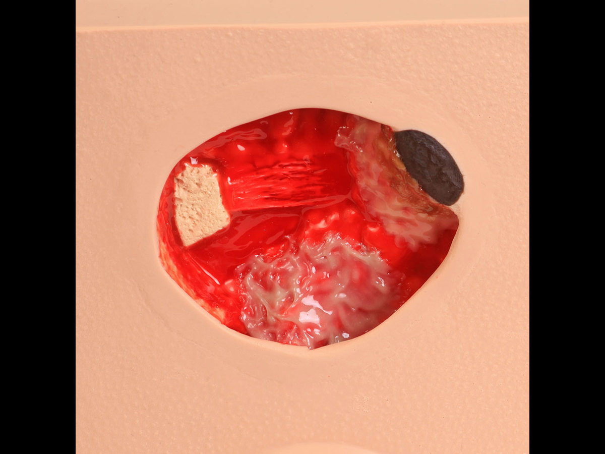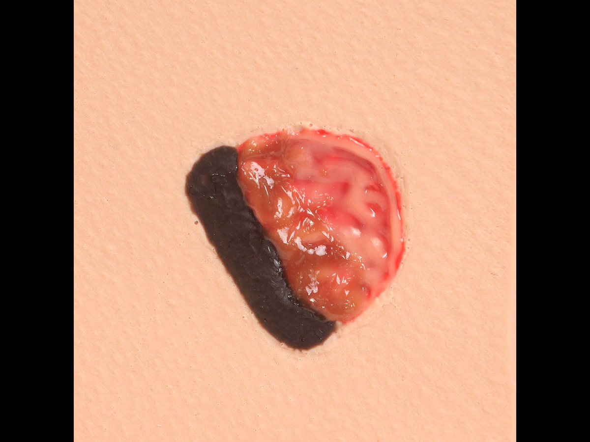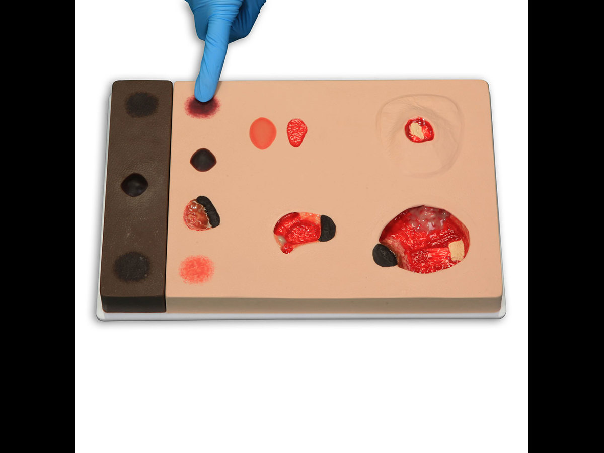 A unique, compact, comprehensive and realistic model displaying the following pressure injuries (per NPUAP 2016 - National Pressure Ulcer Advisory Panel):